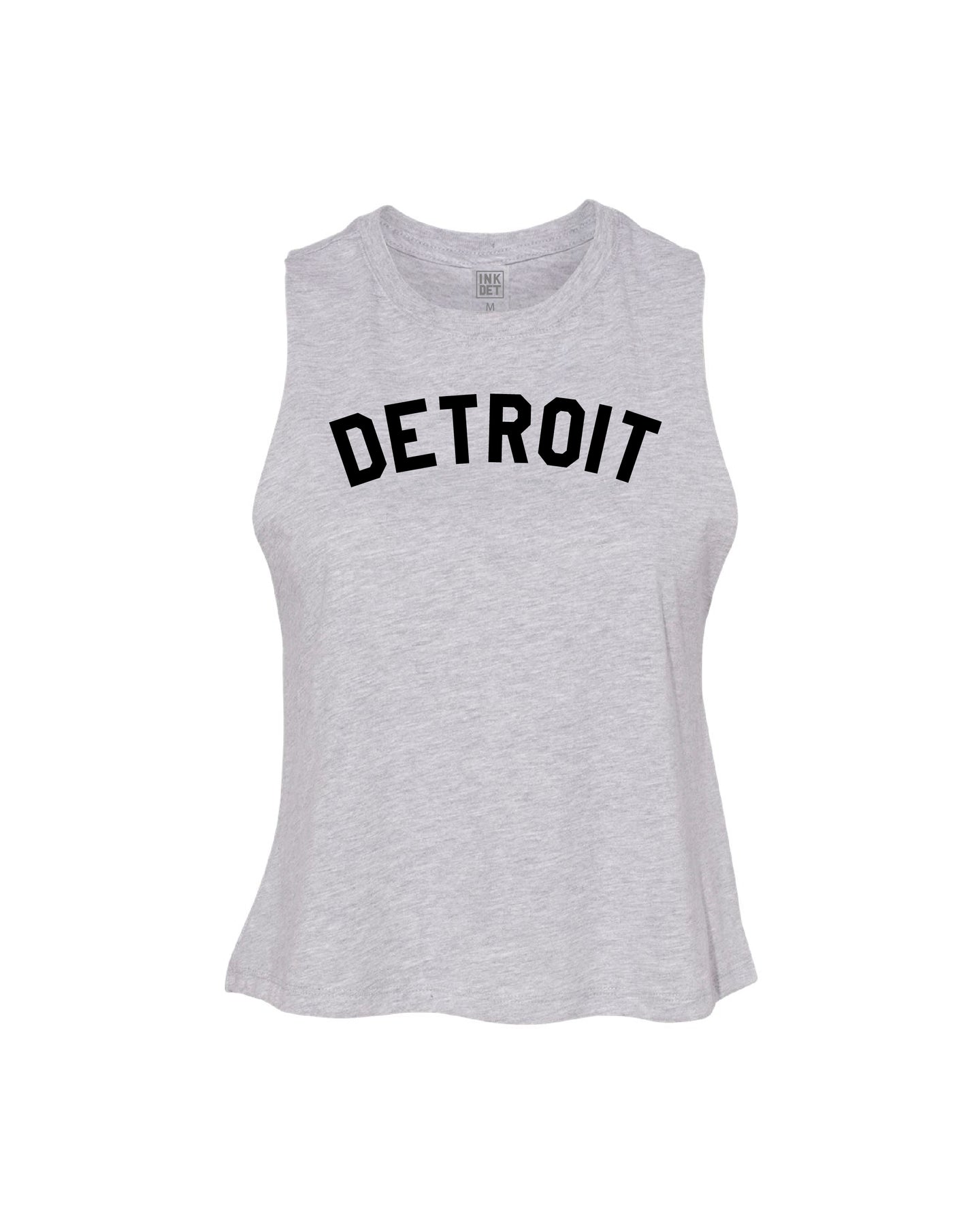 Show off your Motor City pride with this sleek Detroit racerback crop tank top in classic athletic grey. Designed for comfort and style, this lightweight top features a flattering cropped fit and breathable racerback cut—perfect for warm days, workouts, or layering. The bold “Detroit” graphic adds an urban edge, making it a standout piece whether you’re repping the city on the go or keeping it casual. Soft, stretchy, and effortlessly cool, it’s a must-have for any Detroit fan’s wardrobe.