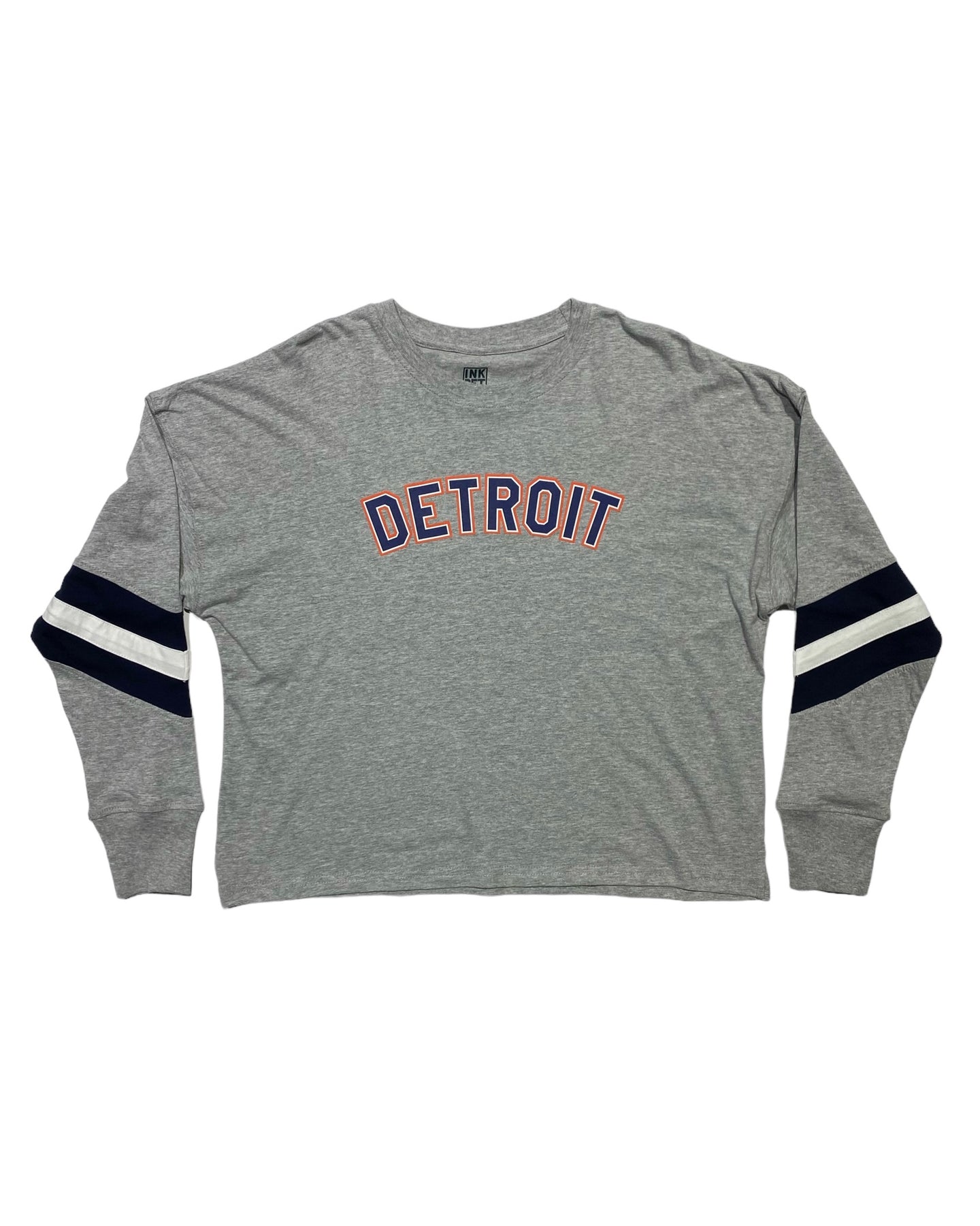 Classic Detroit print in orange white and Navy printed on this brand new boxy, semi cropped, varsity long sleeve T-Shirt will be you spring and fall game day favorite.