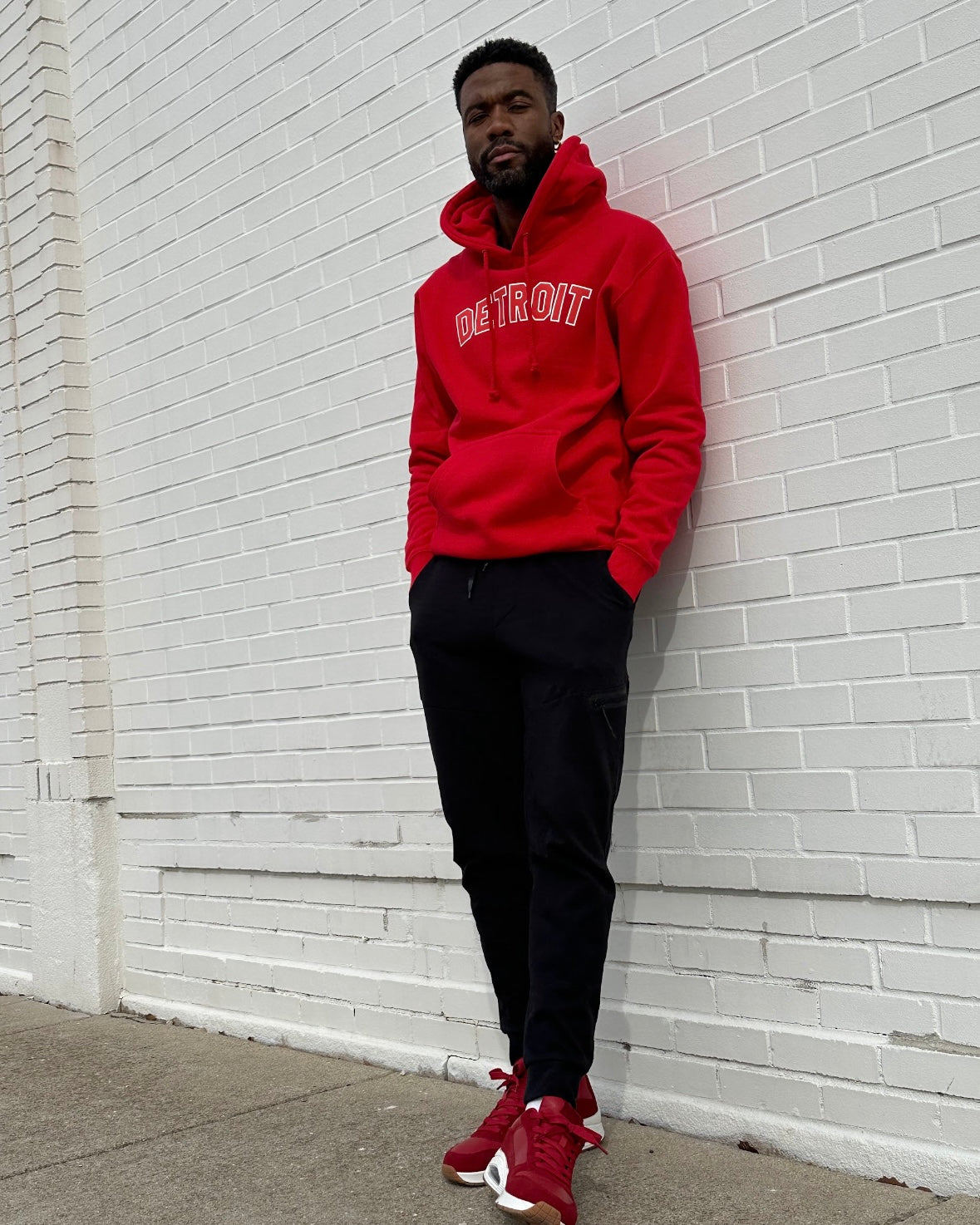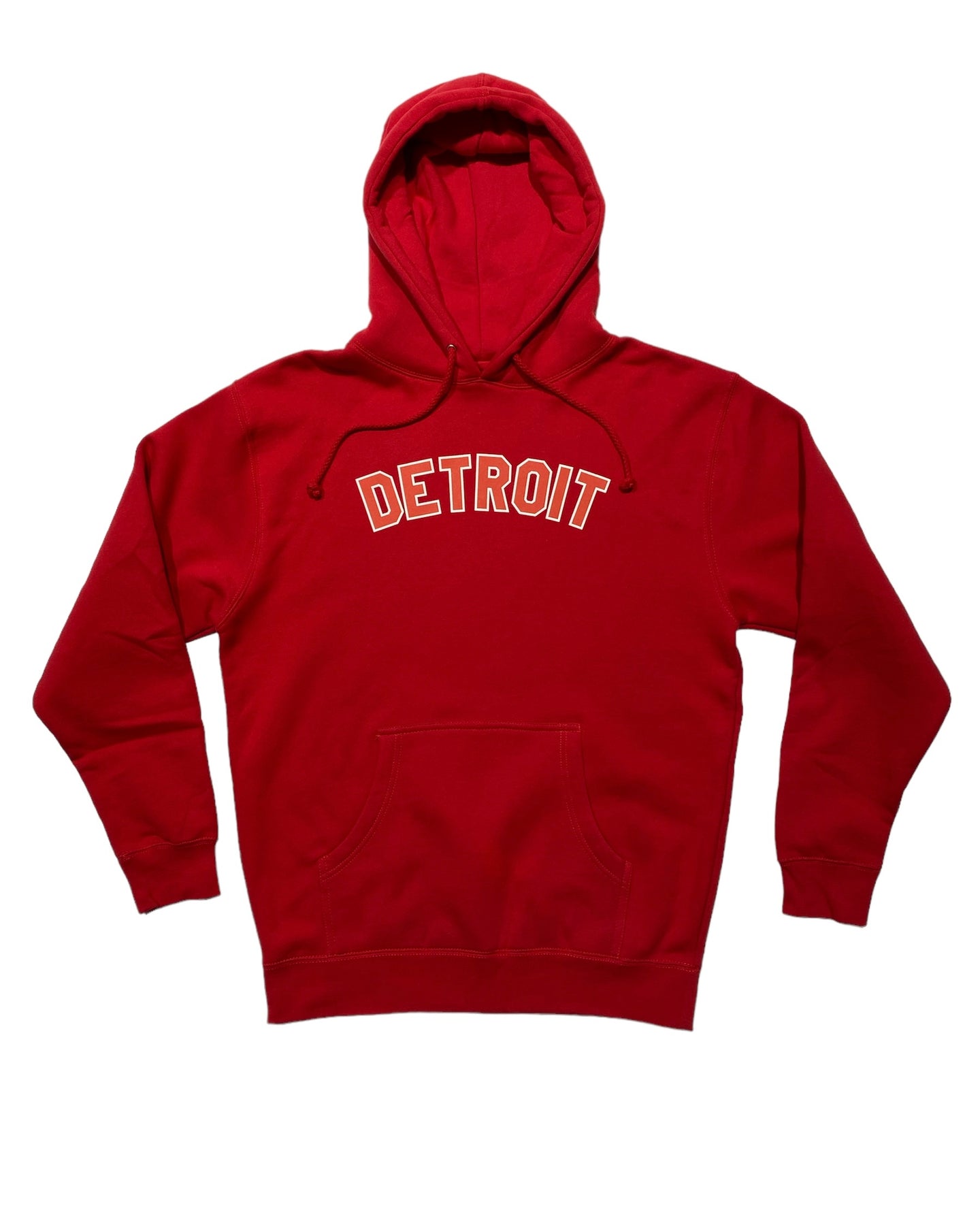 Premium heavyweight hoodie featuring a red and white Detroit print.
