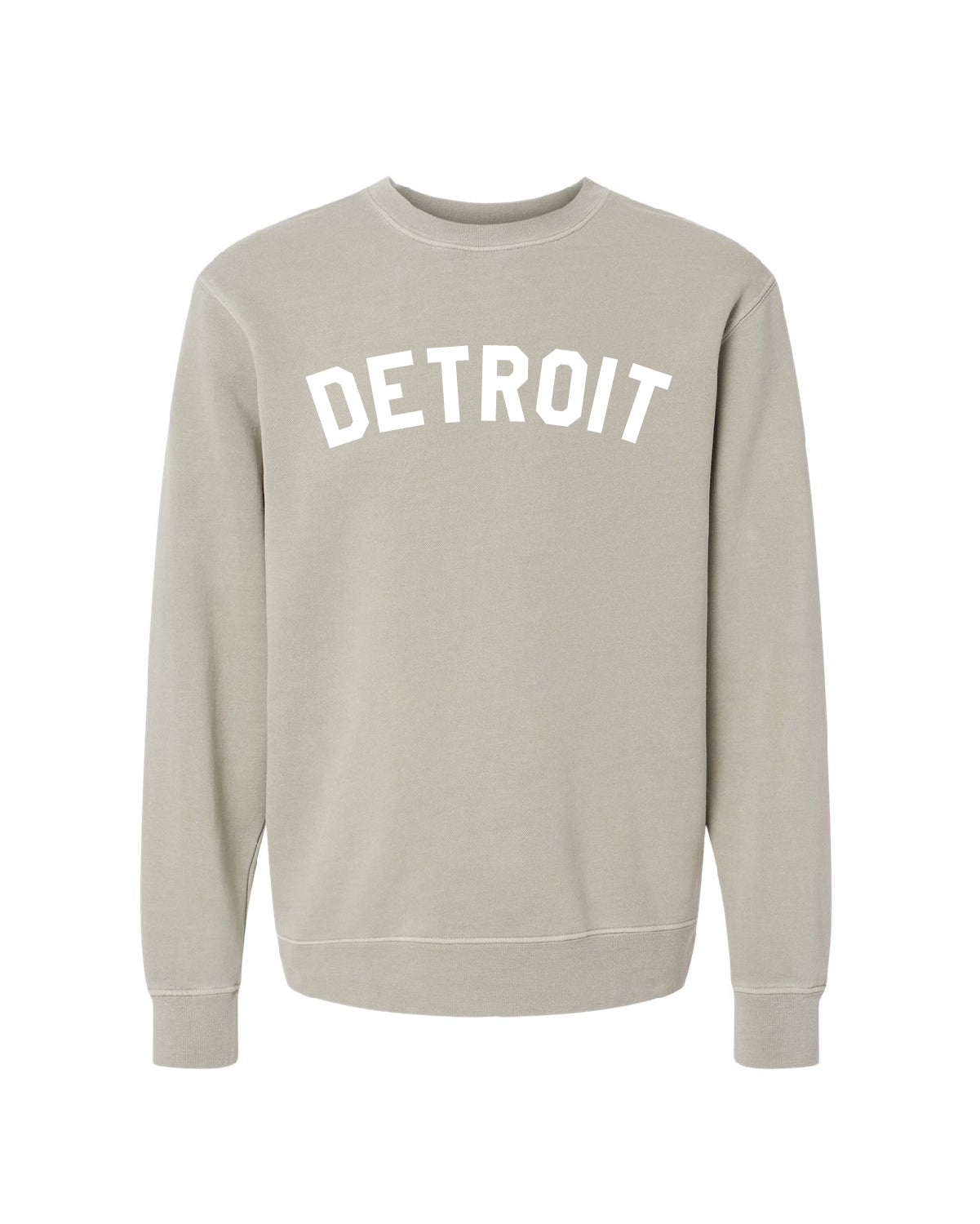 Bold Classic DETROIT print on a super soft pigment dyed crewneck will be your new cool weather fav.