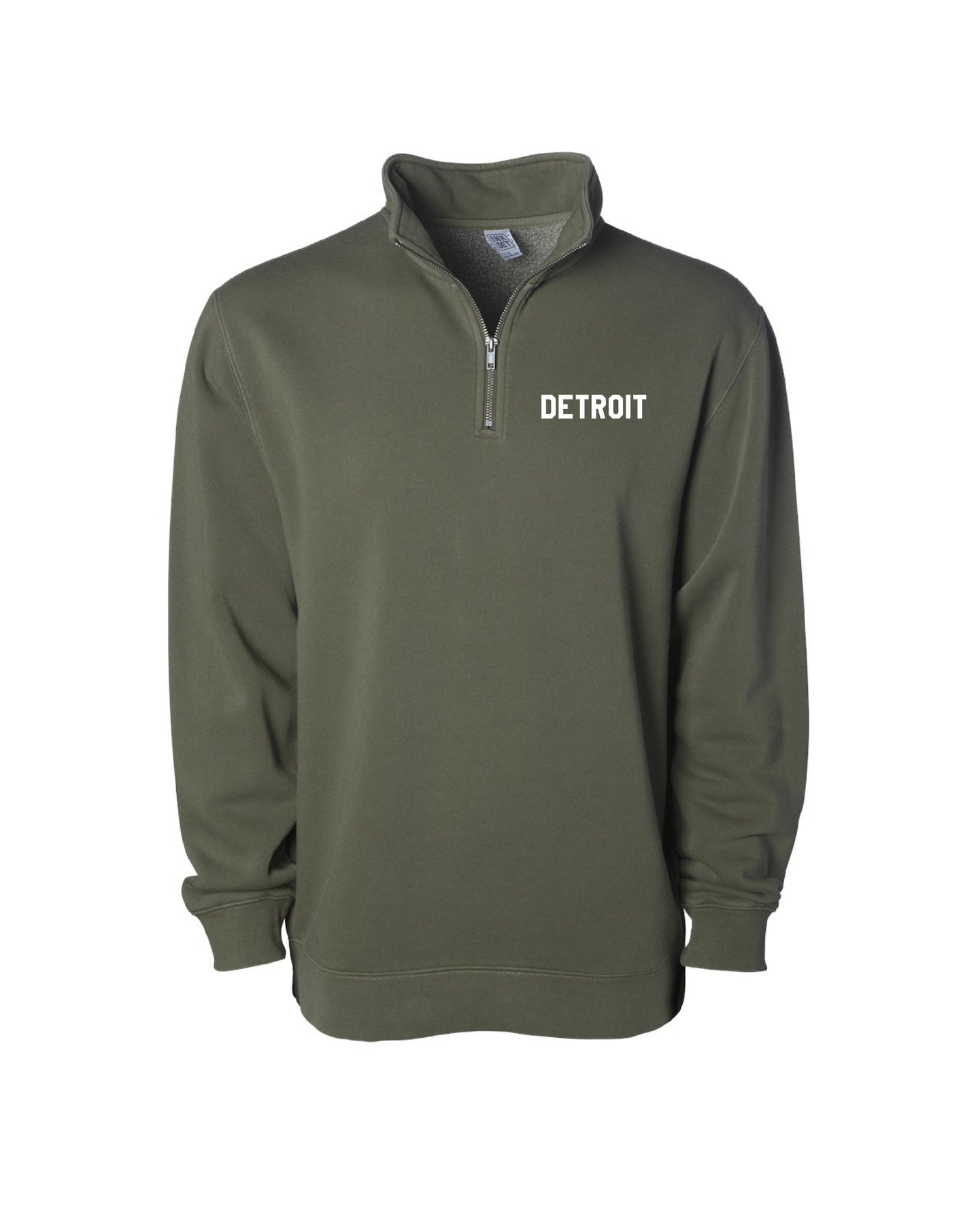 This new pigment dyed, quarter zip, pullover fleece in Army Green will be your cool weather go to shirt. The perfect layer featuring Detroit print on the left chest in white or black.
