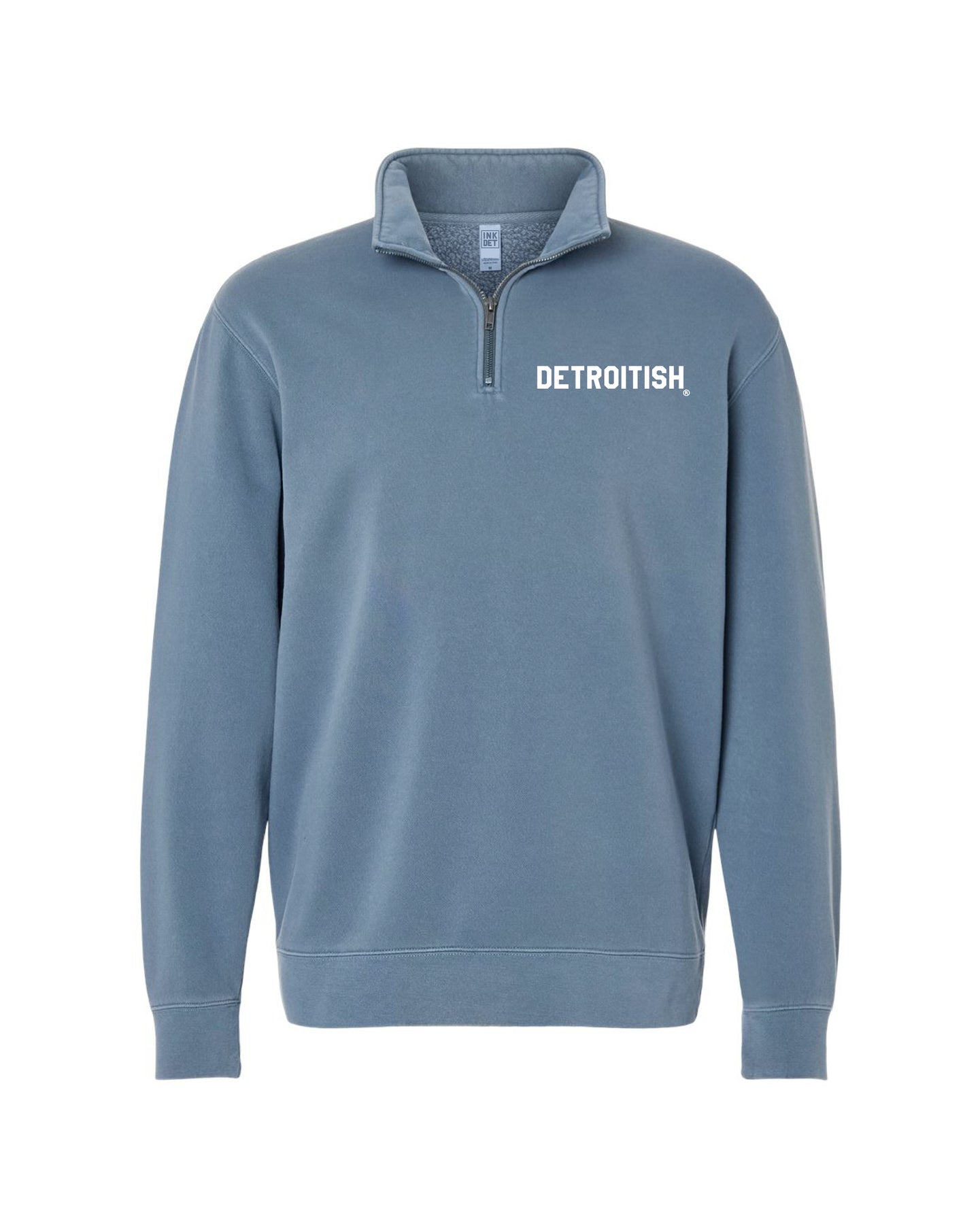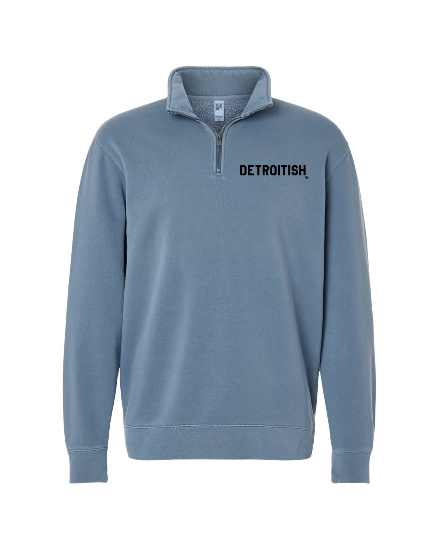 This new pigment dyed, quarter zip, pullover fleece in Slate blue will be your cool weather go to shirt. The perfect layer featuring Detroitish print on the left chest in white or black.
