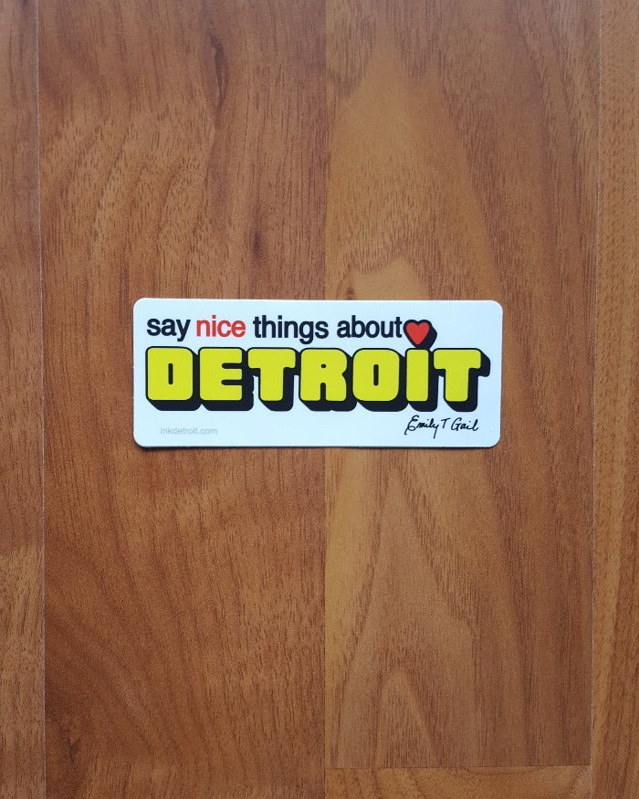 Say Nice Things About Detroit stickers are perfect for your car, laptop, water bottle, and anywhere else you can think of. With UV laminate, our stickers won’t fade, remaining vibrant year-round. Michigan’s seasons may change.