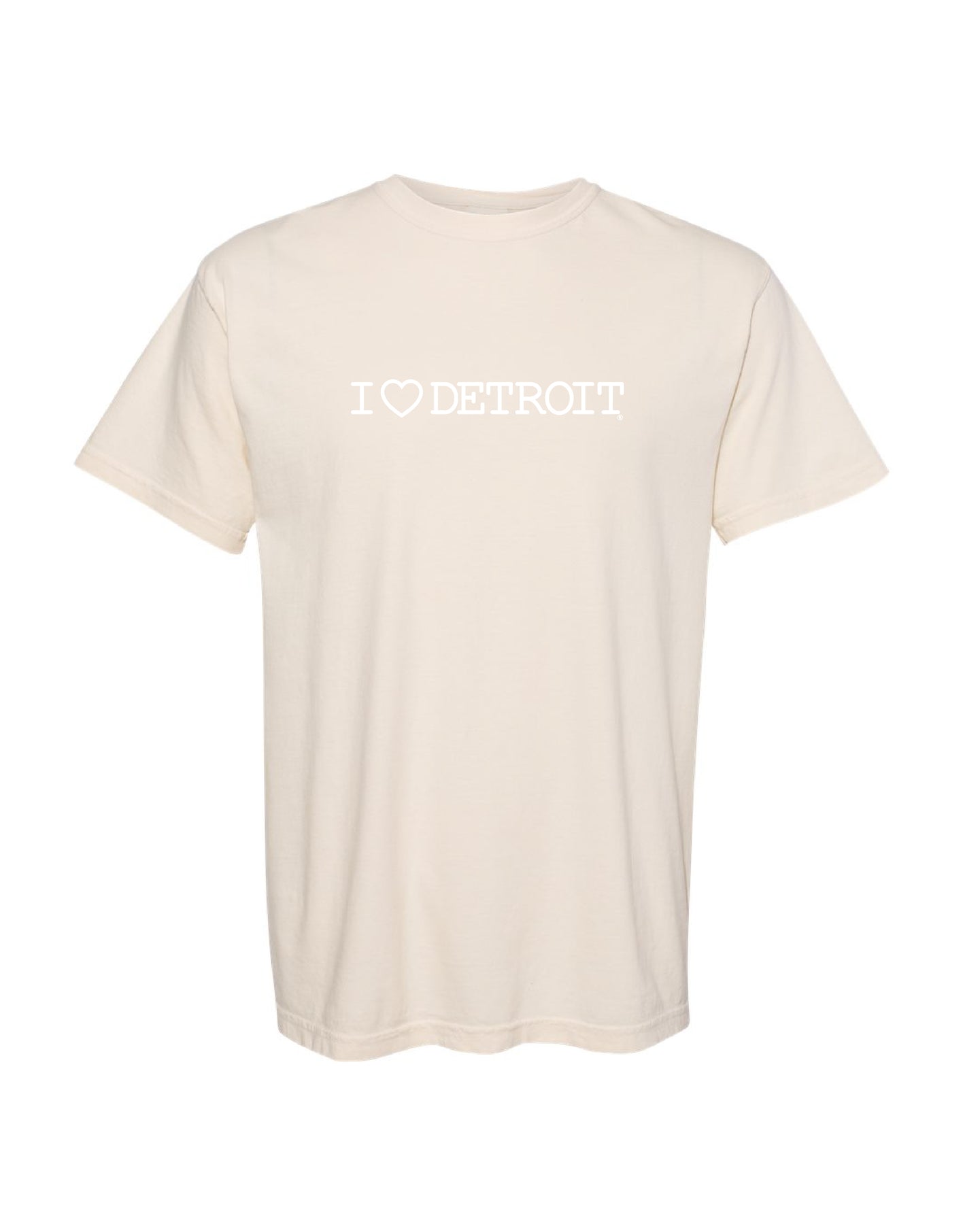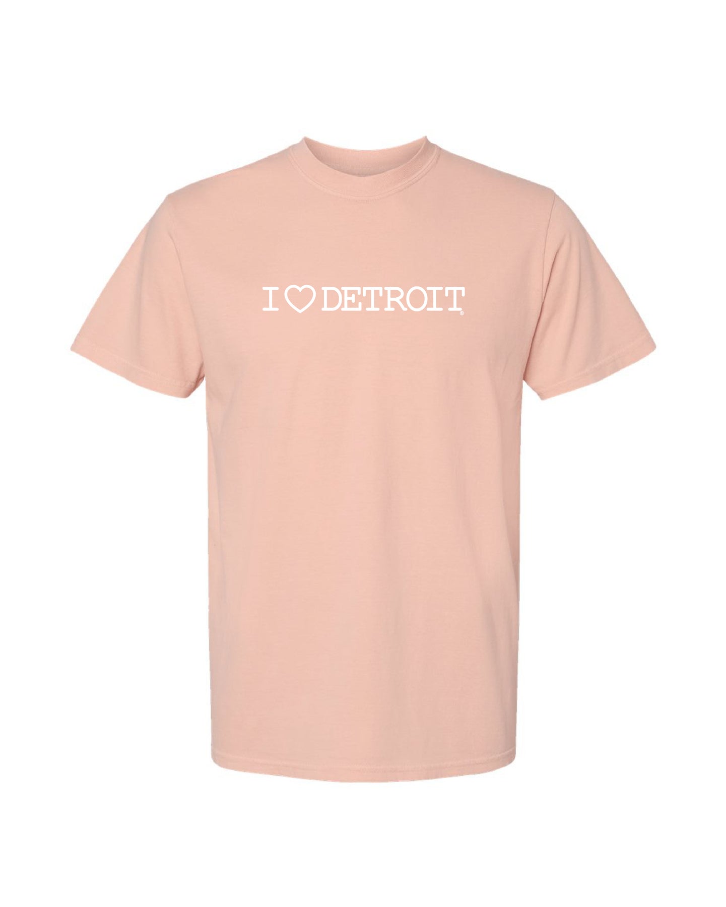 Solid I Love Detroit Print in white on heavyweight pigment dyed T-Shirts in Peach, Bay, and Ivory.